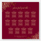 This beautiful seating chart will add elegance and style to your wedding reception while making it easy for your guests to find their tables. The simple design features a burgundy, maroon, or wine red colored background with gold script calligraphy title and ornate lace filigree in the corners. There is space for the names of the couple and wedding date. Has seating assignments for 140 guests at 14 tables with 10 names per table.