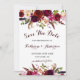 Chic Wedding Save the Date Card featuring watercolor illustration of burgundy, red and pink peonies and roses with feathers accent. Announce your wedding date to family and friends! Please click the "Customize" button to change fonts, sizes and colors. Matching items are also available.