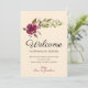 Add this special welcome card to welcome gifts for your out of town guests. This wedding welcome card offers beautiful burgundy flowers and greenery on a cream colored background. The stylish watercolor graphic appears across the top of the vertical invitation. Custom text allows you to add a personal welcome message to your family and friends.