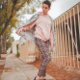 The dainty interlinked rosette design at the waist is truly unique. The poly-spandex makes for a nice fit and available in sizes 0-16. The printing is vibrant and eye-catching.