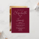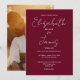 Having your Burgundy Minimalist Script Photo Wedding Invitation match the theme of your party is a great detail that your guests will appreciate. The thoughtfulness of a consistent party theme is often appreciated and can show your guests that you can host a cohesive event.
