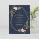 A Navy blue and burgundy Floral design with a gold geometric frame with text in the middle.