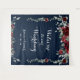 A burgundy navy Welcome To Our Wedding tapestry sign featuring a watercolor painted scenery of burgundy red peonies and silver eucalyptus greenery with 2 cascading vines on either side of pretty white calligraphy script welcoming your guests to your wedding with your first names and numerical wedding date against a solid navy blue background.