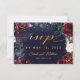 An assembly of deep burgundy red, purple and navy blue peonies adorned with shimmering gold outlines against a dark rich navy blue watercolor canvas with splotches of gold sets the tone for this lavish wedding invitation RSVP with 3 meal choices. A lively script in gold announces your details and invites your guests to your wedding.