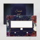 An assembly of deep burgundy red and purple flowers adorned with shimmering gold outlines against a dark rich navy blue watercolor wash, kissed with splotches of gold.