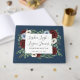 Design features a greenery floral wreath made up of silver dollar and seeded eucalyptus. Burgundy red rose peonies, dusty blue and ivory ecru or white anemones add an elegant touch. The background is a navy blue shade with a white text box. Dark gray fonts are used with a modern layout to complement the theme.