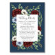Inform your guests with important information that relates to your big event. You can also add a photo or other information to the back if needed. Design features burgundy red rose peonies, dusty blue and ivory ecru or white anemones add an elegant touch over a greenery floral wreath made up of silver dollar and seeded eucalyptus. The background is a navy blue shade with a white text box. Modern and calligraphy fonts in a dark gray shade are used for a unique look.
