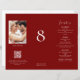 IMPORTANT NOTE: This trifold is supplied flat, WITHOUT pre-scoring. You will need to fold it yourself. To assist you with accurate folding, guidelines are printed on the back for the three panels, plus an extra thin panel to the right hand side for you to apply glue to stick the trifold together once you have folded it. Burgundy All in One Photo Wedding Menu Table No Trifold. This handy DIY trifold combines your Table Number, Menu and Share the Love section with a QR code for your guests to scan and upload their pictures to your chosen website. The word "Menu" is in a set stylish script. Easily personalise the rest of the text as required and replace rhe sample image with your own. Change the sample URL of the QR code to that of your own URL and your QR code will automatically be generated to replace the sample code.