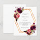 White background with a faux gold geometric frame. Decorated with dark burgundy and pink flowers, roses and boho style feathers. Personalize and add your names and details.