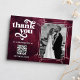 Perfect for weddings, anniversaries, or formal celebrations, this burgundy thank you card allows you to easily link guests to an online photo gallery, wedding website, or personalized message via the QR code. The deep wine tones convey warmth, gratitude, and elegance, while the bold “Thank You” typography ensures your message stands out.