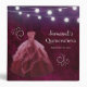Elegant and beautiful Quinceanera or Sweet 16 dress for the birthday girl's photos. White string lights above and silver and burgundy glitter accents on a dark burgundy, faux velvet background.