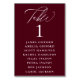 Elegant white calligraphy "table", with guest names listed and table number, wedding table number seating chart card. Background color shown in burgundy red, can be customized.