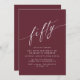 Formal 50th birthday invitations with "fifty" text in a calligraphy font. White script on a dark red background.