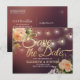 Save The Date Wedding Invitation Postcard Templates - Faux Gold Foil Script, Elegant Watercolor Floral Peach White Roses and String Lights on Burgundy Red Background.