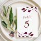 Custom-designed wedding table number cards featuring modern hand calligraphy with burgundy/marsala red foliage design. *Please customize and add each card to your shopping cart individually.*