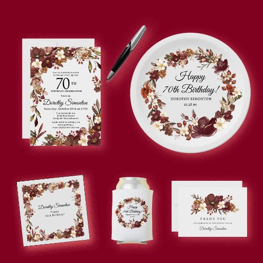 Burgundy Red Mauve Fall Flowers 70th Birthday Wine Label