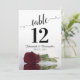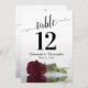 These beautiful table number cards will make it easy for your guests to find their seats at your wedding reception. Features a gorgeous design with lacy script calligraphy and a single burgundy, maroon, or wine red colored rose lying on its side with ripples waves and reflections. There is space for the couple's names and wedding date.