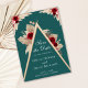 Capture the essence of boho elegance with this stunning Burgundy Roses on Teal Save the Date Card. Featuring a teal background and a beautifully designed floral tent shape with elegant script and minimalist text, this card is perfect for announcing your special day. The decoration is made up of burgundy and pink roses, dried hand palm leaves, and pampas grass, creating a romantic and bohemian feel. This design is perfect for those seeking a modern and trendy vibe with a touch of natural beauty. Make your special day stand out with this stunning Save the Date card! Find matching items in Teal Tropical Rose Garden Wedding Collection. A printable file is available.