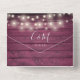 All in one wedding invitation featuring pretty string lights, mason jars, signature style names and chic typography on a burgundy rustic wood background. The invitation includes a perforated RSVP card featuring a QR code. Designed by Thisisnotme©