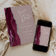 This elegant modern save the date card features a burgundy watercolor agate geode border trimmed with faux silver glitter. The white text appears on a dusty rose background. Easily replace the sample image on the reverse side with a vertical photo of the future bride and groom.