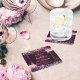 Burgundy background decorated with burgundy and blush pink florals, flowers, and faux silver glitter, sparkles. Personalize and your name and the date.
