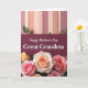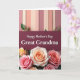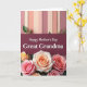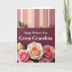 This card features a gentle message set within a layered layout that feels affectionate and close ❤️. Across the top, evenly spaced vertical panels in muted blush, soft peach, and creamy beige create a calm backdrop, with a few small green leaves tucked in like quiet accents. A deep burgundy banner runs through the middle, edged with fine stitch-like detailing that adds texture. Centered on the banner, the words “Happy Mother’s Day Great Grandma” appear in white serif lettering, standing out clearly against the dark strip. Below, a full cluster of roses fills the bottom area, with petals in tender pink, creamy apricot, and soft golden yellow that suggest a loving embrace between generations 🌼. The blooms overlap and spill outward, giving the arrangement a gathered, gift-like look. The overall palette stays warm and gentle, balancing the pale striped background with the rich burgundy center. Small leafy sprigs peek between the roses, and the petals are shaded to look soft and lightly sunlit.