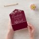 All in one wedding invitation with pretty string lights, signature style names and chic typography on a burgundy background. The invitation includes a perforated RSVP card featuring a QR code. Designed by Thisisnotme©
