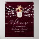 Welcome to our rustic country wedding! This charming poster features a barn wood background with a bohemian touch, accented by a burgundy and peach color scheme. The centerpiece is a floral mason jar showcasing the couple's initials in elegant modern calligraphy. String lights add a warm, inviting glow, setting the perfect tone for our special day.