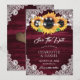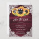 Burgundy rustic floral wedding save the date cards featuring sunflowers on a wood background adorned with white floral lace and string lights. Matching items available.