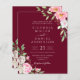An elegant floral budget wedding invitation featuring pink watercolor flowers with modern handwritten calligraphy on a burgundy red background.