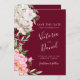 An elegant floral wedding Save the date card featuring pink watercolor flowers with modern handwritten calligraphy on a burgundy red background.