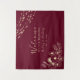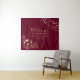 Rustic, elegant, boho burgundy wedding welcome backdrop with gilded gold floral lace, string lights and modern calligraphy script.
