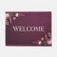 This welcome mat image features a luxurious burgundy background, creating a rich and inviting aesthetic. The pink, lavender and rose gold colored flowers are artfully arranged in the upper left and lower right corners, creating a balanced visual composition. Centered between the floral arrangements, the word Welcome is in white text in capital letters. The flowers are in a realistic style with gradients of purple to light pink. The welcome mat is an aesthetic modern welcome mat in trendy modern colors. The mat has a sturdy latex action backing that allows for a non-slip grip. The mat is approved for indoors and covered outdoor areas. The welcome mat dimensions are 18" by 24".