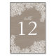An elegant and vintage inspired burlap and lace wedding table number design by Shelby Allison.