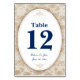 This wedding table number card features a vintage theme with a white oval on a burlap and lace background. The customizable text is navy blue and can be changed to another color.
