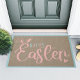 This cute Easter door mat features a fun "Happy Easter" graphic in pink and blue pastels against a faux burlap background with pink bunny ears and a heart accent.