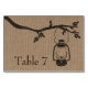 A wedding table number card featuring an illustration of an oil lantern hanging from a tree branch over a burlap inspired background. Personalize the number before you order.