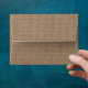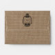 An envelope with a burlap inspired design covering entire outside surface. Top flap features an all black illustration of a camping style oil lantern. Personalize with your monogram.