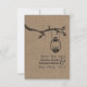 A rustic wedding save the date with a camping / outdoors theme featuring an all black illustration of an oil lantern hanging from a tree branch with leaves. Background is burlap inspired. Personalize the text with details of your occasion.
