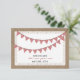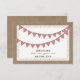 A casual wedding save the date featuring an illustration of red gingham bunting over a lace inspired design. Background on front and back is burlap and lace inspired.