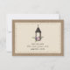 A wedding save the date featuring purple flowers and greenery arranged in a lantern. Personalize the text. Background is burlap and lace inspired.