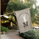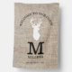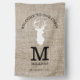 Welcome to our cabin flag personalized with monogram and family name. A white deer head silhouette on a rustic burlap background makes the welcome house flag unique.