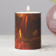 This pillar candle features a burning fire by deluxephotos.