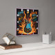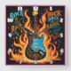 A vibrant guitar stands ablaze with colorful flames, surrounded by energetic lettering celebrating the essence of rock and roll.