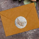 A wedding invitation envelope seal, round sticker set with a distinct vintage feel, with an elaborate copper/gold decoration set against an antique-look, grey parchment background.