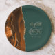 These elegant modern wedding plates feature a burnt orange watercolor design trimmed with faux gold glitter. Easily customize the gold-colored text on a dark green background, with the names of the bride and groom in handwriting calligraphy over a large ampersand.