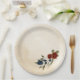 Unique wedding paper plate featuring romantic burnt orange and navy blue flowers and green leaves.