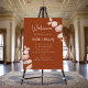 Dark burnt orange background, decorated with eucalyptus stems, sprigs. Personalize and add your names and the details.