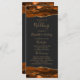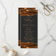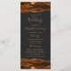 This elegant, modern wedding program features burnt orange watercolor agate top and bottom borders trimmed with gold faux glitter. The text appears in elegant gold-colored handwriting and copperplate fonts on an off-black background.