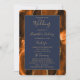 This elegant, modern wedding program features a burnt orange agate background trimmed with gold faux glitter. The text appears in elegant gold colored handwriting and copperplate fonts on a dark navy blue rectangle.